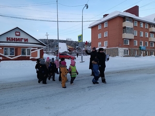 В ходе встречи детям был показан обучающий мультфильм «Дорожный дозор». Дети вспомнили основные правила безопасного поведения на дороге зимой и важности использования световозвращающих элементов в темное время суток.